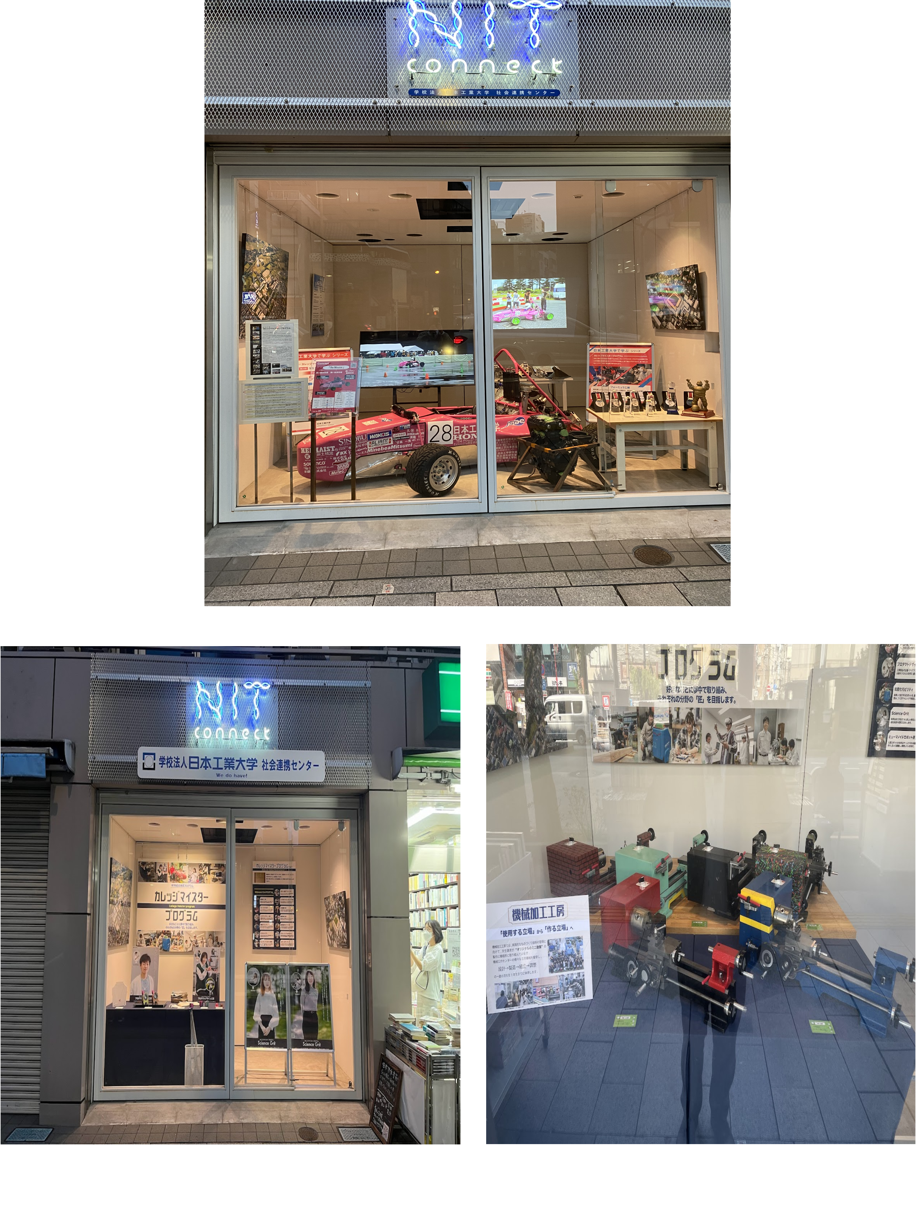 日本工業大学の工業技術博物館にて展示されている日本の産業発展に貢献した機械類以外にも、カレッジマイスタープログラムの学生たちが作る作品等の展示も行っています。普段の生活では目にすることのない様々なジャンルの学生作品は、古書の街神保町でも人々の目に留まるようで、足を止めて展示物を覗きこむ多くの人々の姿を目にすることができます。 今後も「つなぐ」基地として様々な展示を続けていく予定です。